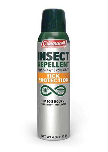 Feel comfortable while keeping insects away with Coleman Tick Protection Dry Formula 25% DEET Insect Repellent. Formulated with 25% DEET, this insect repellent spray repels ticks that may carry Lyme disease and mosquitoes that may carry West Nile virus. This unscented insect spray gets tough on bugs without an overwhelming smell. Made with a powder dry formula, this non greasy and non oily bug spray with DEET feels comfortable on your skin. This bug repellent offers up to 8 hours of mosquito and tick repellent protection and comes in a convenient spray can for easy use. Keep this DEET bug spray on hand for camping, hiking and other outdoor adventures.