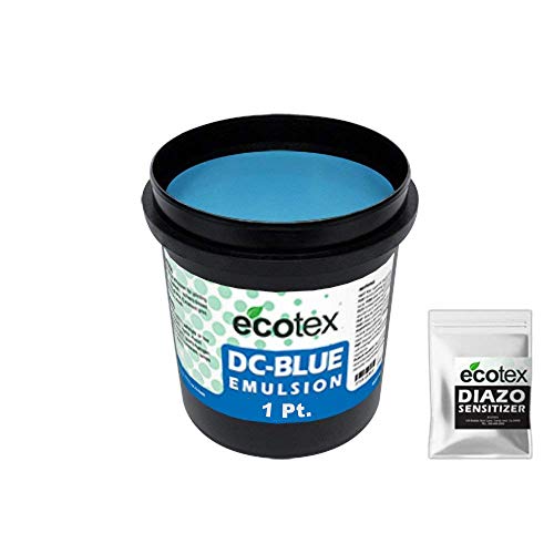 Ecotex DC-BLUE is the ultimate Dual-Cure Textile Emulsion. This product is compatible with all ink systems. It is highly resistant to solvent, UV, Plastisol, & Short run Water Based inks. Before use, Diazo must be added and allowed to activate emulsion. It's easy, just see Diazo for simple Instructions. Once the Diazo has been mixed it is ready for use. Apply to clean, degreased, dried screen with a scoop coater. Be sure to use appropriate application techniques. Reclaiming Ecotex DC-BLUE is easy with Ecotex Emulsion Remover. NOTE: This emulsion comes with a bottle of Diazo.