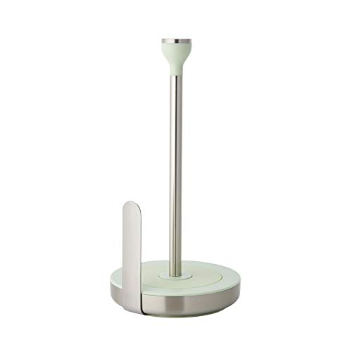 A soft-touch friction pad on the base keeps paper towels in place without unraveling. Paper towel roll simply slides on and off the holder; no need to remove end cap. Includes durable stainless steel tear bar for ease of use. Subtle matte accents from the KitchenAid color palette complement the brushed stainless steel elements. Sturdy weighted base creates stability when tearing.
