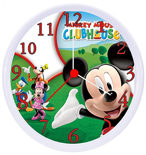 Product Description 10" Mickey Mouse Clubhouse Wall Clock. the clock has a white, plastic frame and a clear, plastic cover. Requires 1 AA battery (not included) Great gift for any Mickey Mouse fan!!
