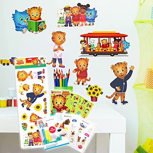 RoomMates Daniel Tiger Wall Decal Set - 30 Pc Daniel Tiger Room Decor Bundle With 100+ Daniel Tiger Stickers! (RoomMates Daniel Tiger). The RoomMates Daniel Tiger peel and stick wall decals set comes with 30 Daniel Tiger decals featuring Daniel Tiger and friends, as wells as over 100 Daniel Tiger stickers! These RoomMates Daniel Tiger decals fit great next to any other Daniel Tiger room decor and are the perfect addition to any kids party as Daniel Tiger party supplies, party decorations, and more. Fans of all ages will love their new Daniel Tiger wall decor! Made in the USA with high-quality, non-toxic vinyl, RoomMates wall decals are detailed and durable, allowing for repeated application without damaging walls. Officially licensed RoomMates Daniel Tiger room decor. The Daniel Tiger decals set also includes bonus Secret Life of Pets stickers!