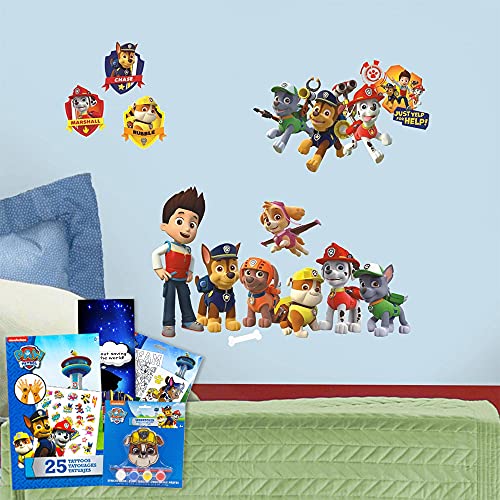 RoomMates Paw Patrol Wall Decals Bundle ~ 37 Pc Paw Patrol Room Decor Set With Paw Patrol Coloring Posters And Suncatcher Paint! (Paw Patrol Decals). The RoomMates Paw Patrol wall decals set comes with 37 RoomMates Paw Patrol peel and stick wall decals, as well as one Paw Patrol suncatcher paint set, and one Paw Patrol paint poster set! Simply peel and stick these Paw Patrol room decor decals to apply. These RoomMates Paw Patrol decals fit great next to any other Paw Patrol room decor and are the perfect addition to any kids party as Paw Patrol birthday decorations, supplies, and more. Fans of all ages will love their new Paw Patrol decals! Made in the USA with high-quality, non-toxic vinyl, RoomMates wall decals are detailed and durable, allowing for repeated application without damaging walls. Officially licensed RoomMates Paw Patrol room decor. The Paw Patrol Boys decal set also comes with bonus Paw Patrol temporary tattoos and a superhero door hanger!
