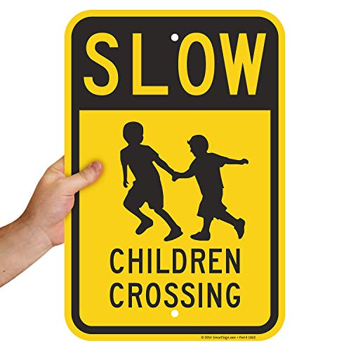 SmartSign heavy-duty aluminum rectangle crossing sign, Legend "Slow Children Crossing" with Graphic. These rugged signs are made from heavy-duty, 63 mil thick aluminum. Unlike steel signs, our aluminum signs do not rust. Signs are printed with 3M screen printing or 3M outdoor digital inks designed specifically for outdoor traffic and parking signs for the ultimate in durability. They should last up to 15 years outside. Signs have rounded, burr-free corners, for longer life and a professional appearance. Compare with lower costs signs that use a lower cost and often hazardous square corner. Thick 63 mil signs do not bend. They have been proven to outlast the toughest of storms. Signs have large holes for easy mounting. The holes are "cleared" (unlike competitors' signs). Measures 12-inches width by 18-inches height. Black on yellow color combination.