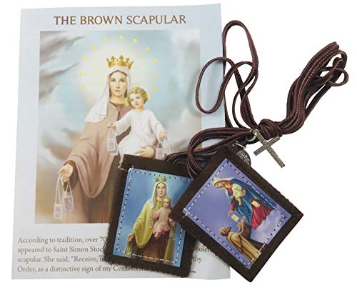 Set of one brown scapular and pamphlet. The scapular features an image of Our Lady of Mt. Carmel stitched on one end and an image of St. Simon stitched on the other and includes two charms on the cord: a crucifix and a Mary pendant.