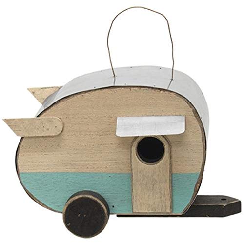 Product Description rustic, painted wood camper with distressed, natural edges. Camper is accented with a metal awning, and it is wrapped with a metal sheet for a vintage, 1950's inspired design
